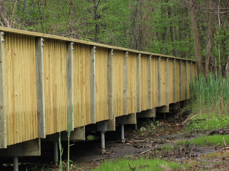 Helical pier anchor systems were installed to support this boardwalk in a nature preserve area of Salem , NH. Due to our ability to use low impact installation equipment in the preserve's fragile habitat we were given the job to construct their boardwalk.