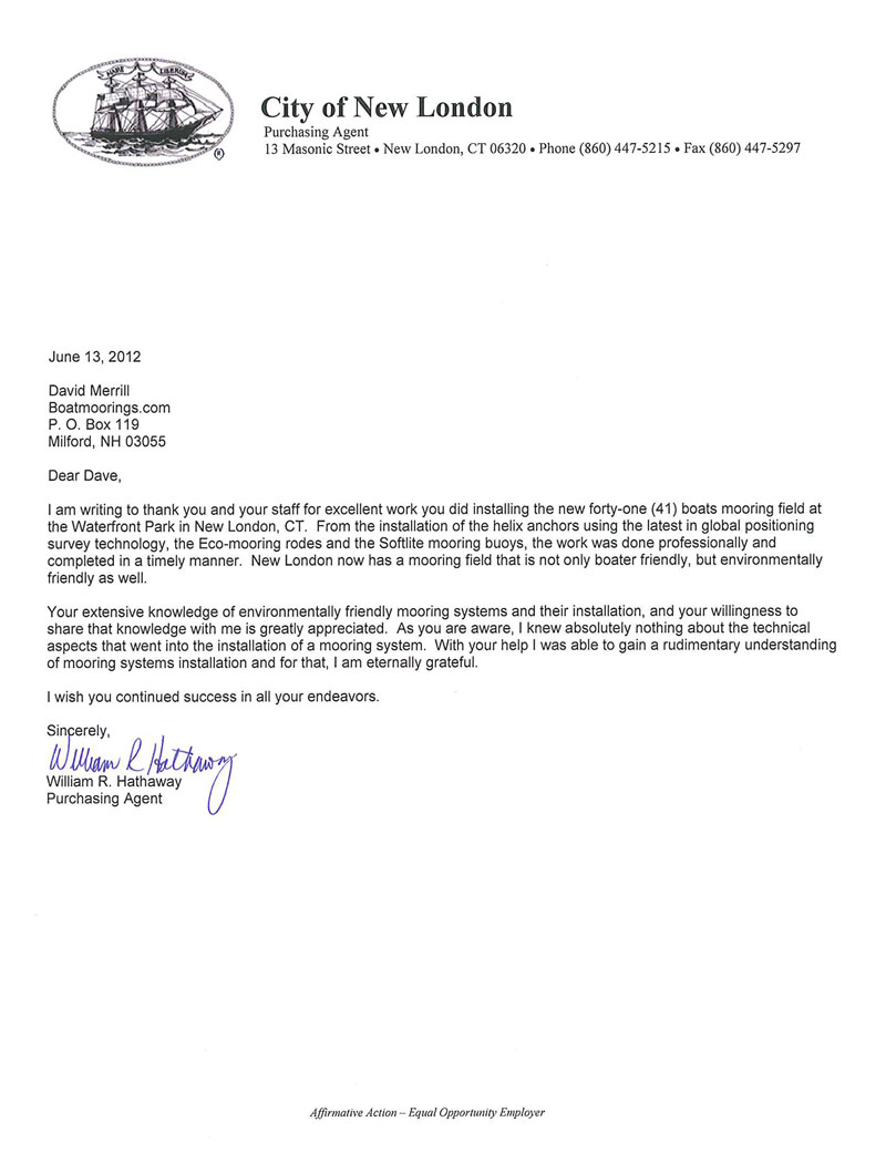 I am writing to thank you and your staff for excellent work you did installing the new forty-one (41) boats mooring field at the Waterfront Park in New London, CT. From the installation of the helix anchors using the latest in global positioning survey technology, the Eco-mooring rodes and the Softlite mooring buoys, the work was done professionally and completed in a timely manner. New London now has a mooring field that is not only boater friendly, but environmentally friendly as well.